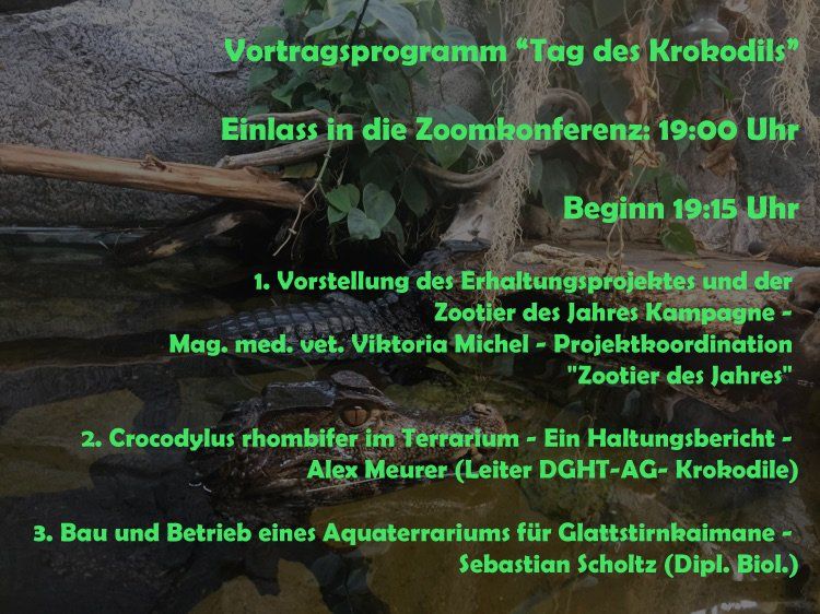 Im Jahre 2021 unterstützten wir in Zusammenarbeit mit der DGHT AG-Krokodile die "Zootier des Jahres"-Kampagne der ZGAP, da die diesjährig Wahl des Zootiers auf das Krokodil gefallen ist. Genauer gesagt wollten wir einem Projekt zum Schutze der Kubakrokodile (Crocodylus rhombifer) helfen. In diesem Rahmen fand am Sa. den 23.10.2021 einen Online-Themenabend statt der über